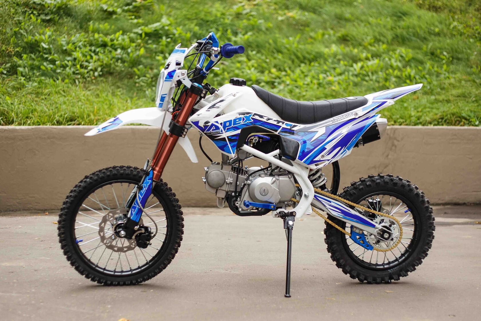 О надёжный питбайк APEX125 идеален для поездок по грунтовым дорогам и бездорожью. Хорошо чувствует себя на мягком и среднем грунте, разгоняется до 90 км/ч. Оснащён CNC траверсами, фарой, алюминиевыми ободами, весит всего 90 кг. Питбайк прост в управлении и не требует специального ухода, подойдёт как новичкам, так и любителям мотокросса.У кроссового мотоцикла APEX125 отличный узнаваемый дизайн. Конструкция подчёркивает неуступчивый спортивный характер питбайка, который не остановится ни перед одним препятствием. Пластик комбинированный, прочный, не ломается при сгибании. Кроссовый мотоцикл APEX125 доступен в красном и синем цвете, при этом в основной цвет окрашен не только пластик, но и обода колёс и другие детали питбайка.Передняя подвеска — телескопическая нерегулируемая вилка перевёрнутого типа, которая отлично подходит для преодоления ям, ухабов и других неровностей плохих дорог или их отсутствия. Задняя подвеска маятниковая с моноамортизатором. Руль 22 мм с высоким подъёмом и перекладиной удобен для мотоциклистов разного роста. Ручки руля — комфортные PRO TAPER. Питбайк оснащён складными рычагами сцепления и переднего тормоза, а также CNC-лапкой переключения передач.Питбайк весит всего 75 кг, при этом выдерживает вес до 150 кг. Оснащён CNC траверсами, рама полудуплексная стальная, мотоцепь качественная. Колёса спицованные, сделаны из прочного и лёгкого алюминия. Размер заднего колеса — 14 дюймов (350 мм), переднего — 17 дюйм (430 мм). Тормоза дисковые, передний тормозной суппорт двухпоршневой, задний — однопоршневой.Питбайк оснащён карбюратором с фильтром нулевого сопротивления VM22 MIKUNI и одноцилиндровым четырёхтактным двигателем с воздушным охлаждением. Надёжный мотор мощностью 9 л. с. и объемом 125 см³ разгоняет кроссовый мотоцикл APEX125 до 90 км/ч. Коробка передач механическая, четырёхступенчатая. Система зажигания электронная (CDI), для запуска двигателя можно использовать кикстартер и электростартер.СверхпроходимостьПокрышки с шипами и высоким грунтозацепом идеальны для бездорожья. Мощность мотора и небольшой вес питбайка позволяют ему преодолевать значительные препятствия и непролазную грязь, хорошо заходить в подъёмы.Для поездок при низкой видимости и в ночное время суток питбайк оснащён фарой, которая включается при повороте замка зажигания (1 – выключить, 2 – включить, 3 – свет). Также в комплекте есть щиток для номера, который ставится вместо фары.Питбайк 125 относится к недорогим моделям, которые при должной эксплуатации работают без сбоев и капризов. Кросс неприхотлив в обслуживании, не занимает много места в гараже. При необходимости в нём легко сменить любую повреждённую деталь. Купить питбайк 125 вы можете в официальном магазине Мотолэнд, здесь же всегда можно приобрести запасные детали и комплектующие, которые стоят недорого и всегда есть в продаже. При покупке питбайка не забудьте о защитной экипировке.